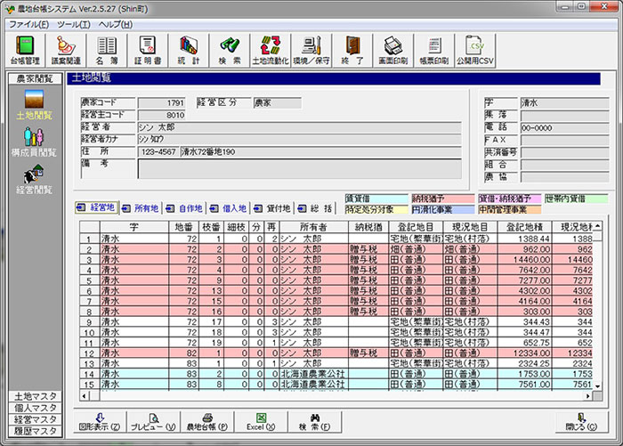 農家の経営地・所有地・貸借地等が一筆単位で表示され納税猶予対象地や世帯内貸借地等の土地状況が色で判別出来ます。